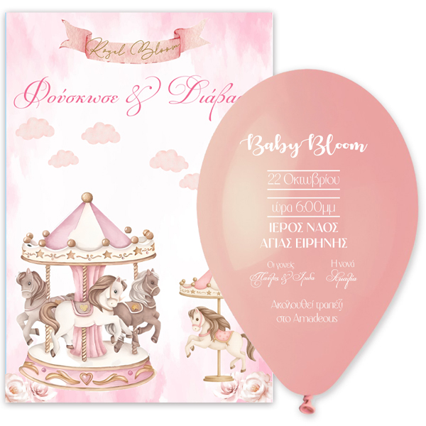 Προσκλητήριο Βάπτισης Μπαλόνι – Ροζ Καρουζέλ