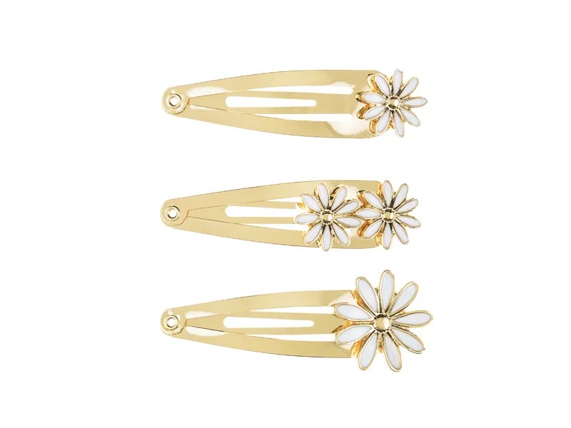 Μεταλλικά κλιπ μαλλιών Μαργαρίτα σε χρυσό χρώμα με λευκά στοιχεία. Το σετ περιέχει 3 τεμάχια με κλιπ μαλλιών