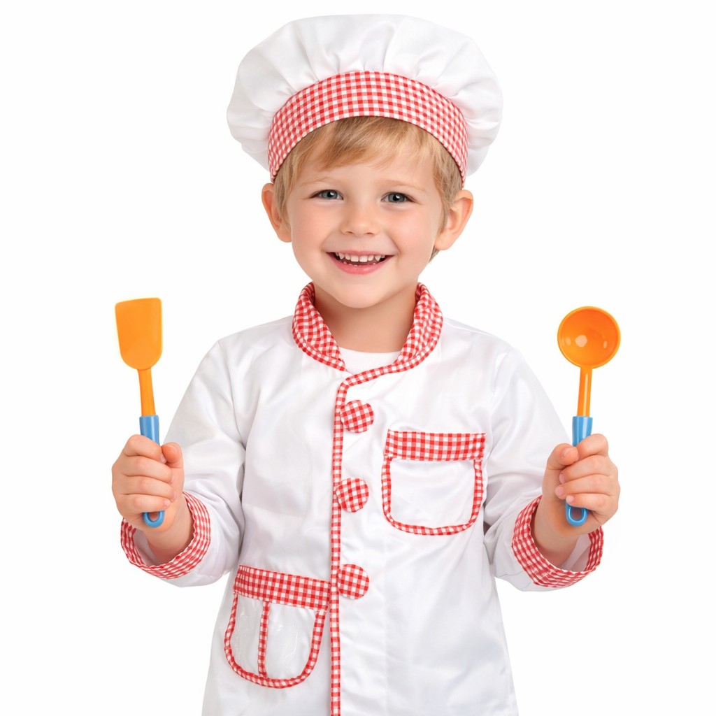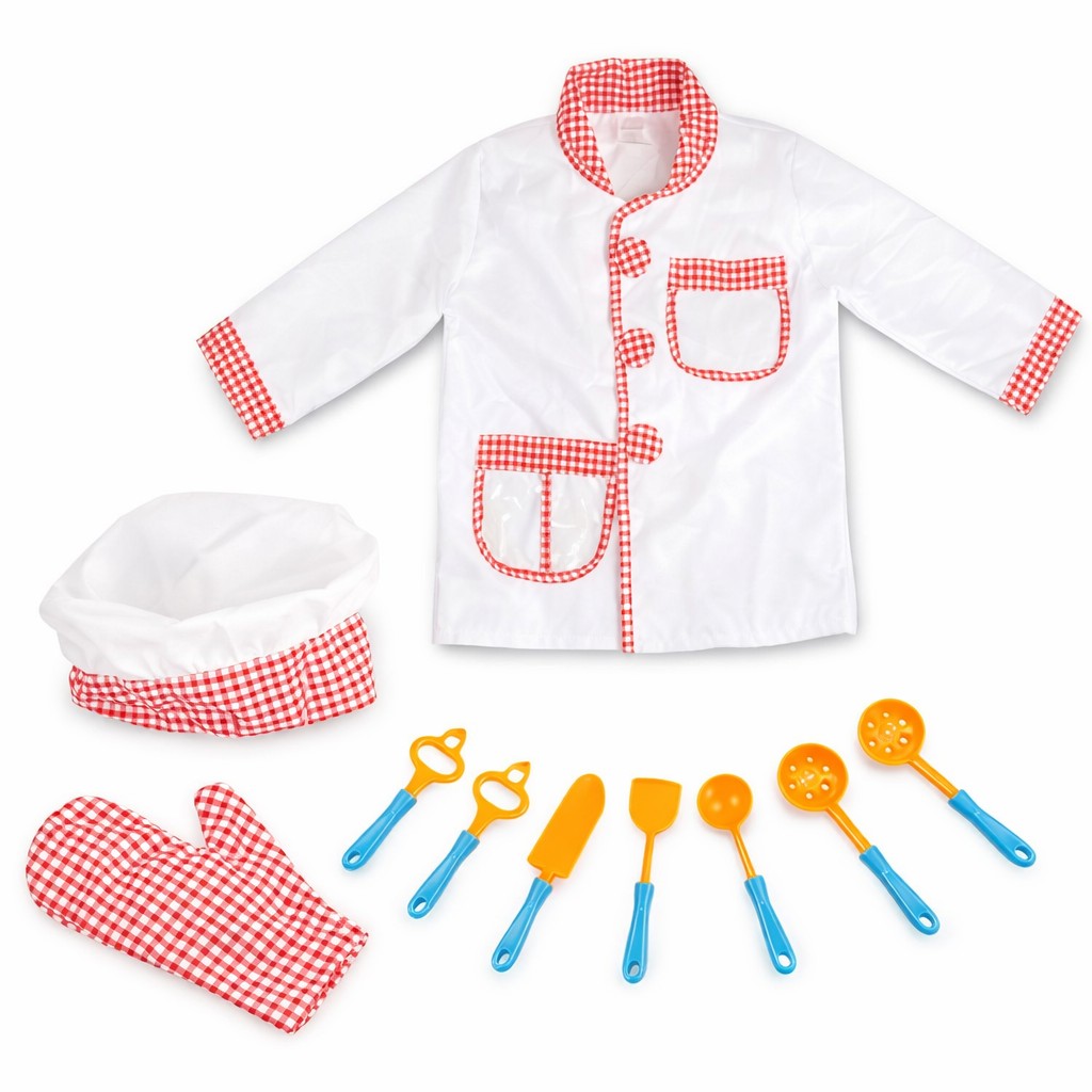 - Περιλαμβάνει: σακάκι με καρό γιακά, γάντι κουζίνας, σκουφάκι και εργαλεία μαγειρικής