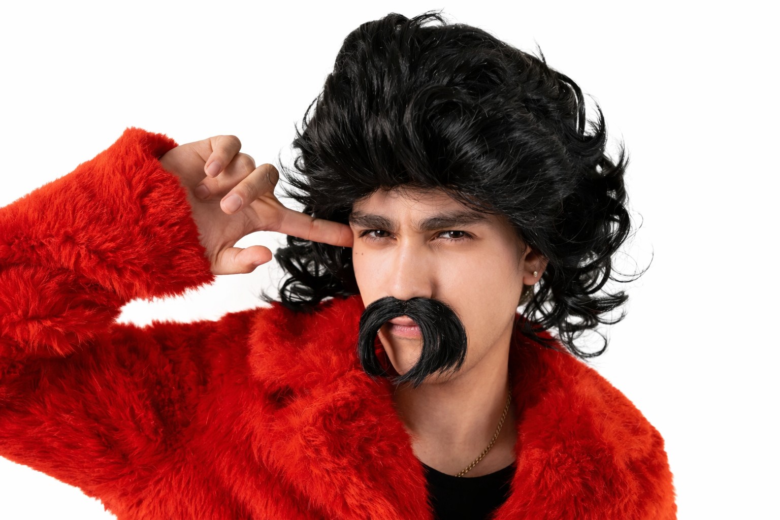Αποκριάτικο σετ με μαύρη περούκα και μουστάκι, ιδανικό για θεματικά πάρτι, καρναβάλι και εντυπωσιακές εμφανίσεις.