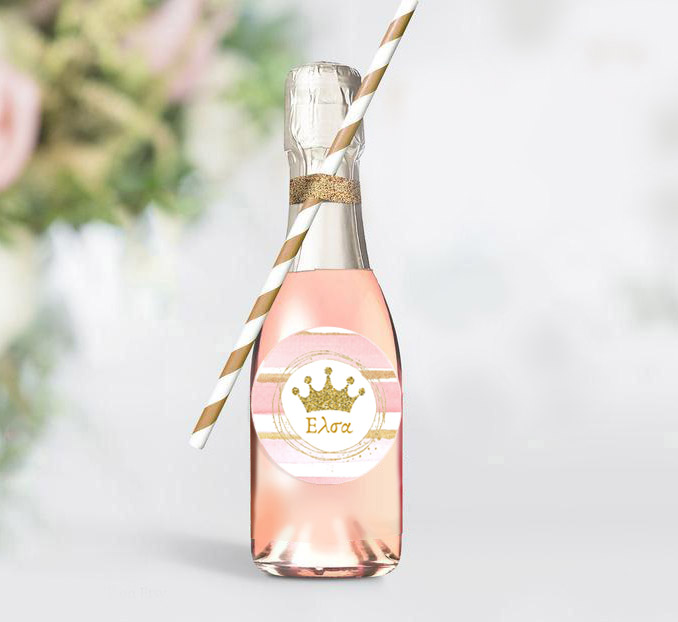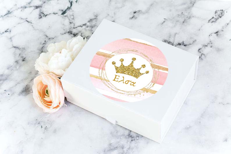 Στρογγυλά προσωποποιημένα αυτοκόλλητα για τη βάπτιση του μωρού σας, με θέμα την Κορώνα για κοριτσάκι. Μπορείτε να τα χρησιμοποιήσετε σε κουτάκια μπομπονιέρας, σε μπουκάλια και ποτήρια ή σε οποιοδήποτε άλλο αντικείμενο θέλετε να διακοσμήσετε για τη βάπτιση.