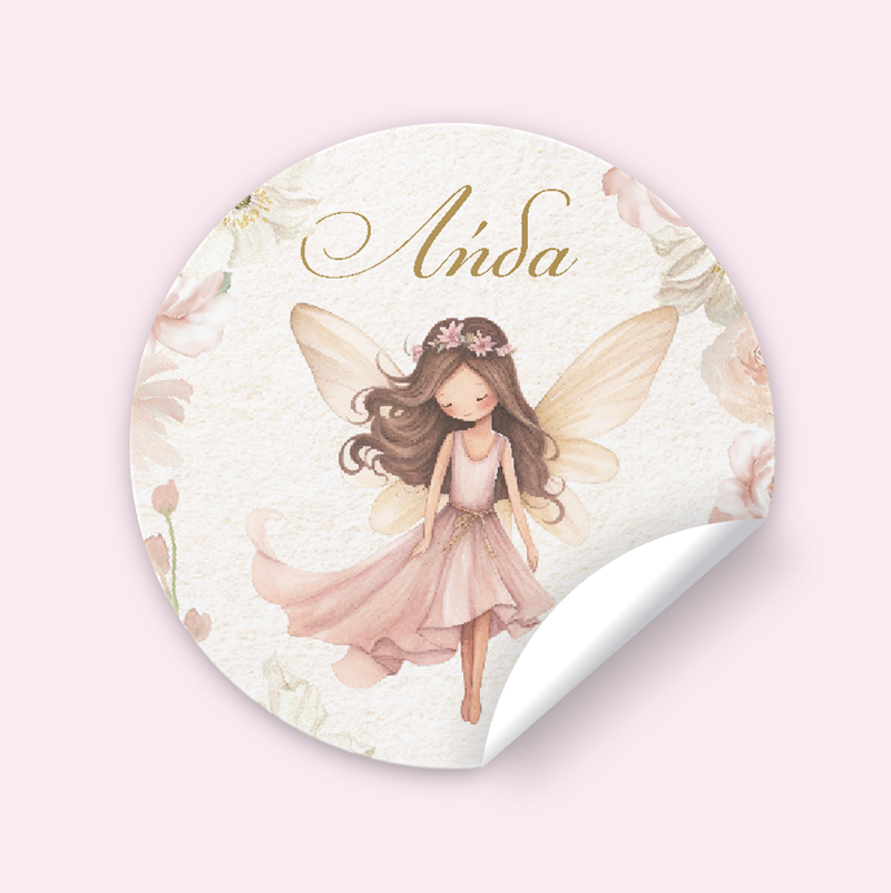 Στρογγυλά προσωποποιημένα αυτοκόλλητα Νεραϊδοχώρα. Μπορείτε να τα χρησιμοποιήσετε σε κουτάκια μπομπονιέρας, σε μπουκάλια και ποτήρια ή σε οποιοδήποτε άλλο αντικείμενο θέλετε να διακοσμήσετε για τη βάπτιση του μωρού σας.