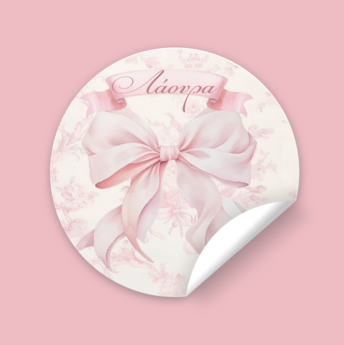 Στρογγυλά προσωποποιημένα αυτοκόλλητα με θέμα Ροζ Φιόγκος και με coquette αισθητική. Μπορείτε να τα χρησιμοποιήσετε σε κουτάκια μπομπονιέρας, σε μπουκάλια και ποτήρια ή σε οποιοδήποτε άλλο αντικείμενο θέλετε να διακοσμήσετε για τη βάπτιση ή το πάρτυ.