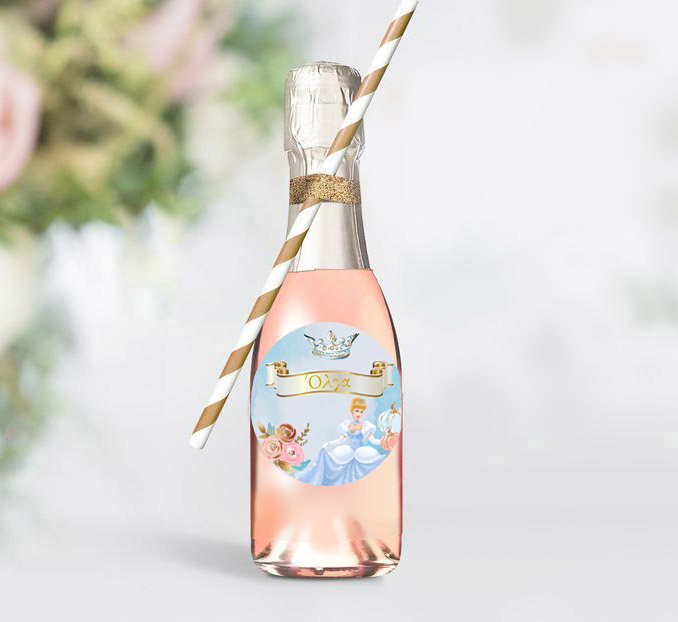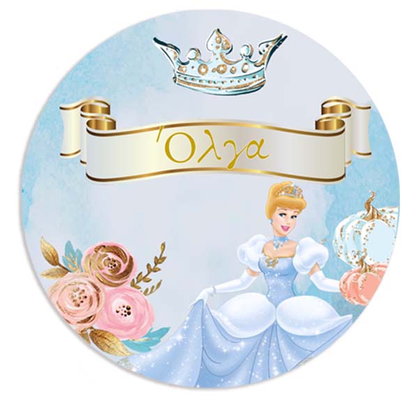 Στρογγυλά προσωποποιημένα αυτοκόλλητα με τη Σταχτοπούτα. Μπορείτε να τα χρησιμοποιήσετε σε κουτάκια μπομπονιέρας, σε μπουκάλια και ποτήρια ή σε οποιοδήποτε άλλο αντικείμενο θέλετε να διακοσμήσετε για τη βάπτιση ή το πάρτυ.