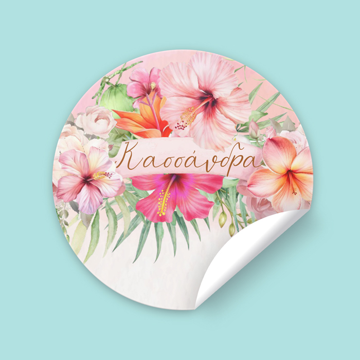 Στρογγυλά προσωποποιημένα αυτοκόλλητα με θέμα Tropical Ιβίσκος. Μπορείτε να τα χρησιμοποιήσετε σε κουτάκια μπομπονιέρας, σε μπουκάλια και ποτήρια ή σε οποιοδήποτε άλλο αντικείμενο θέλετε να διακοσμήσετε για τη βάπτιση ή το πάρτυ.