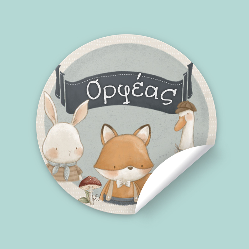 Στρογγυλά προσωποποιημένα αυτοκόλλητα με θέμα Ζώα του Δάσους. Μπορείτε να τα χρησιμοποιήσετε σε κουτάκια μπομπονιέρας, σε μπουκάλια και ποτήρια ή σε οποιοδήποτε άλλο αντικείμενο θέλετε να διακοσμήσετε για τη βάπτιση ή το πάρτυ.