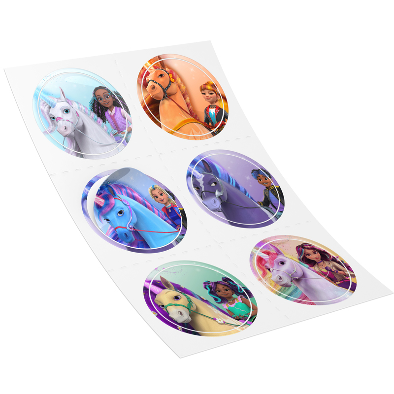 Στρογγυλά αυτοκόλλητα με σχέδιο Ακαδημία Μονόκερων, για να διακοσμήσεις τα αντικείμενα του πάρτυ ή να τα δώσεις ως ενθύμιο δώρο στους μικρούς καλεσμένους!