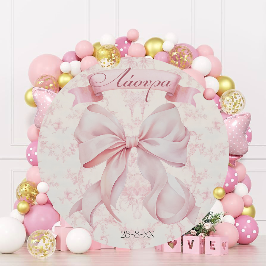 Στρογγυλή αφίσα από μουσαμά με θέμα Ροζ Φιόγκος, για να διακοσμήσετε το χώρο της βάπτισης του μωρού σας!