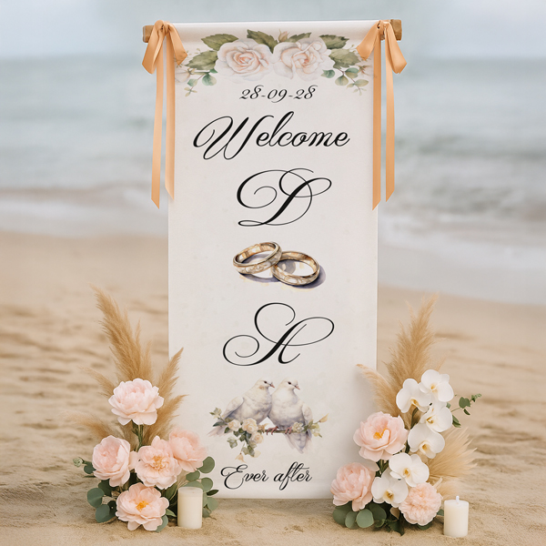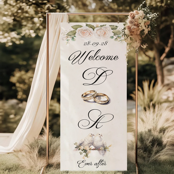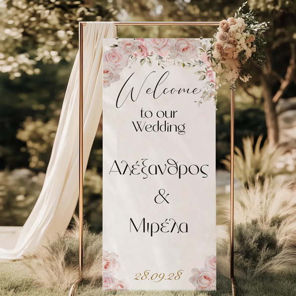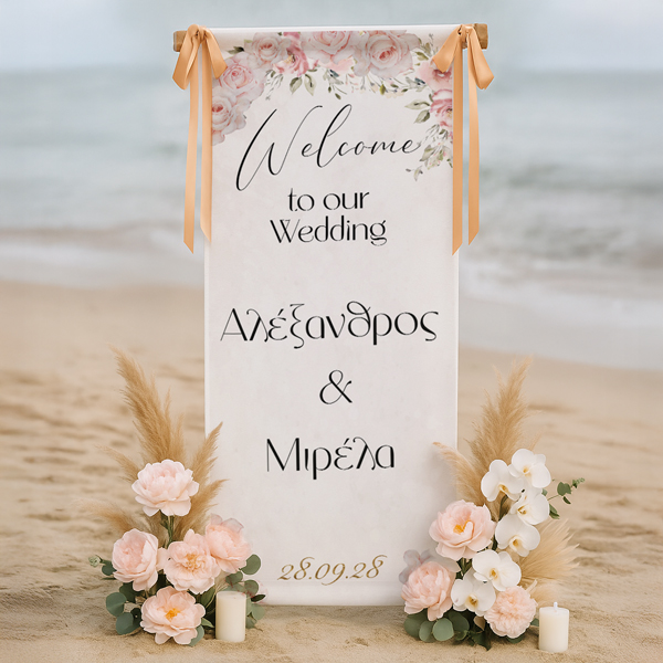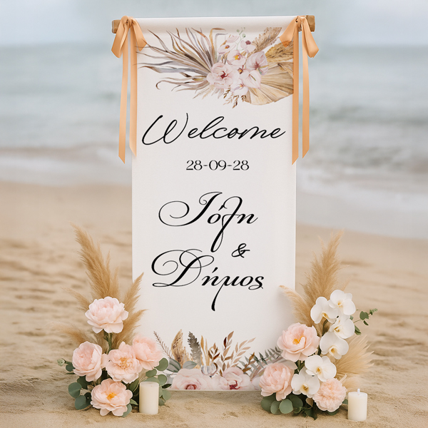 Αφίσα Γάμου Υφασμάτινη με Φλοράλ σχέδιο, για τη διακόσμηση του γάμου σας. Μπορεί να τοποθετηθεί στην είσοδο της δεξίωσης, στο τραπέζι ευχών ή σε οποιοδήποτε σημείο του χώρου. Ένα ξεχωριστό στοιχείο που θα δώσει στιλ στη σημαντικότερη μέρα της ζωής σας.