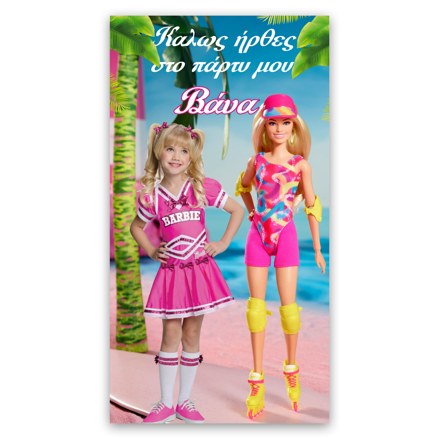 Μεγάλη διακοσμητική αφίσα με θέμα την Barbie και εκτυπωμένη τη φωτογραφία του παιδιού, για να υποδεχθείτε τους καλεσμένους σας στο πάρτυ γενεθλίων ή για να διακοσμήσετε το δωμάτιό του!