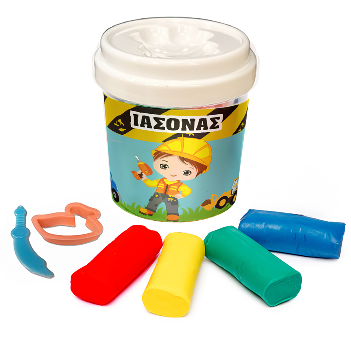 Βαζάκι με πλαστελίνες και κουπ-πατ και θέμα Εργοτάξιο! Ιδανικό για δωράκια στους μικρούς καλεσμένους του πάρτυ: το πλαστοζυμαράκι θα τους χαρίσει ατελείωτες ώρες χαράς και δημιουργίας!