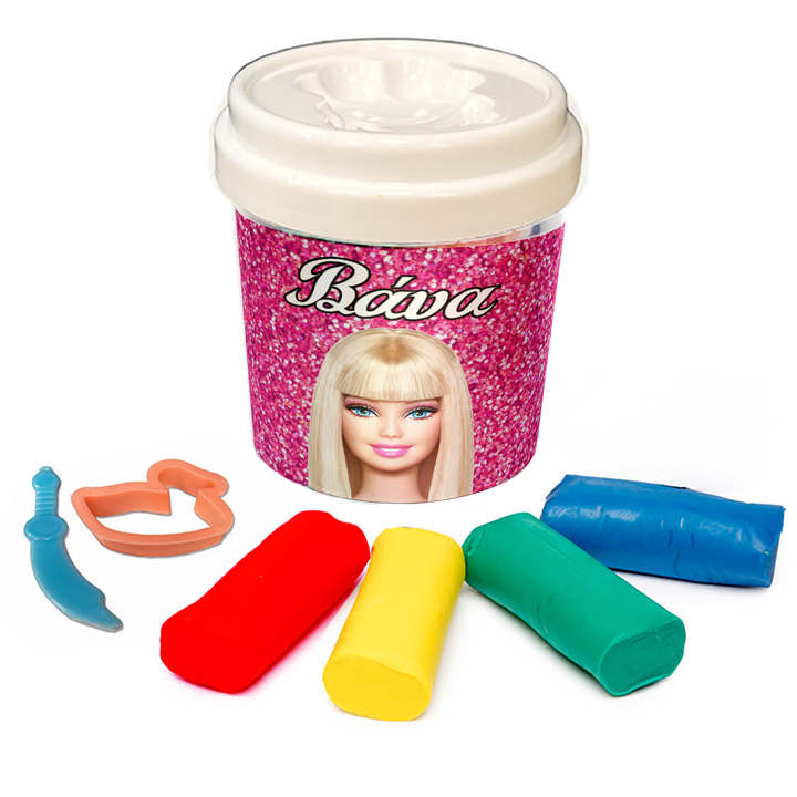 Βαζάκι με πλαστελίνες και κουπ-πατ και θέμα Barbie! Ιδανικό για δωράκια στους μικρούς καλεσμένους του πάρτυ: το πλαστοζυμαράκι θα τους χαρίσει ατελείωτες ώρες χαράς και δημιουργίας!