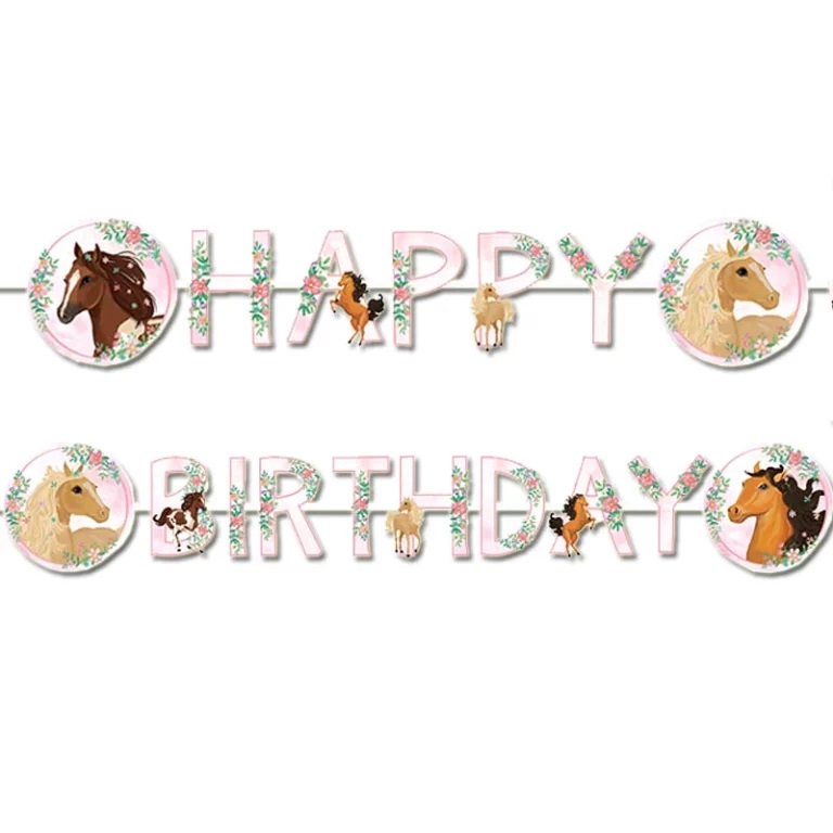 Γιρλάντα Happy Birthday με θέμα Άλογο και όμορφα λουλούδια, για να διακοσμήσεις όμορφα τον χώρο στο θεματικό πάρτυ γενεθλίων!