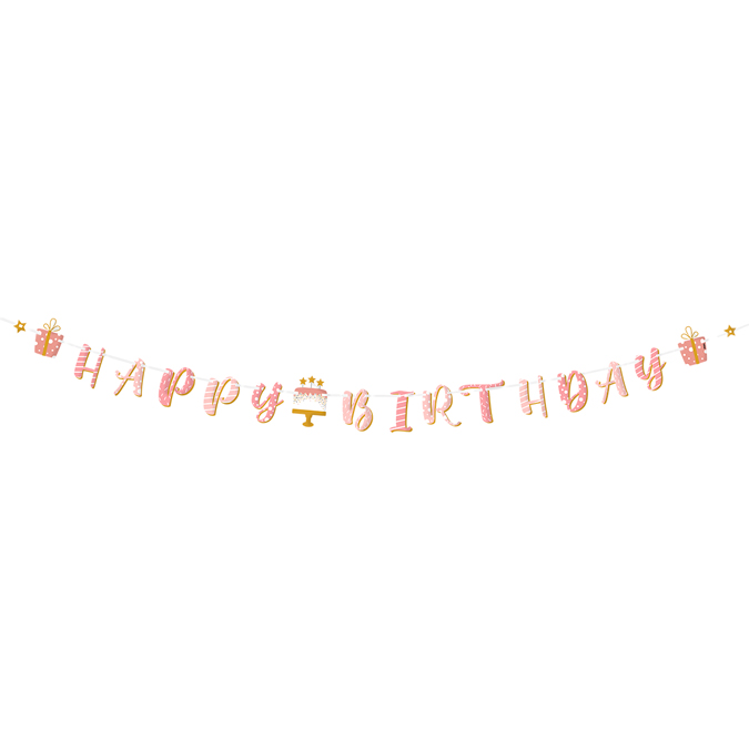 Γιρλάντα Happy Birthday με τούρτες και δώρο σε σχέδιο Rose Confetti, για να διακοσμήσετε το πάρτυ γενεθλίων!