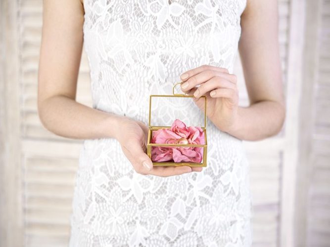 Διακοσμητικό γυάλινο κουτί με χρυσές λεπτμέρειες Ιδανική επιλογή για έναν εντυπωσιακό στολισμό γάμου ή βάπτισης.