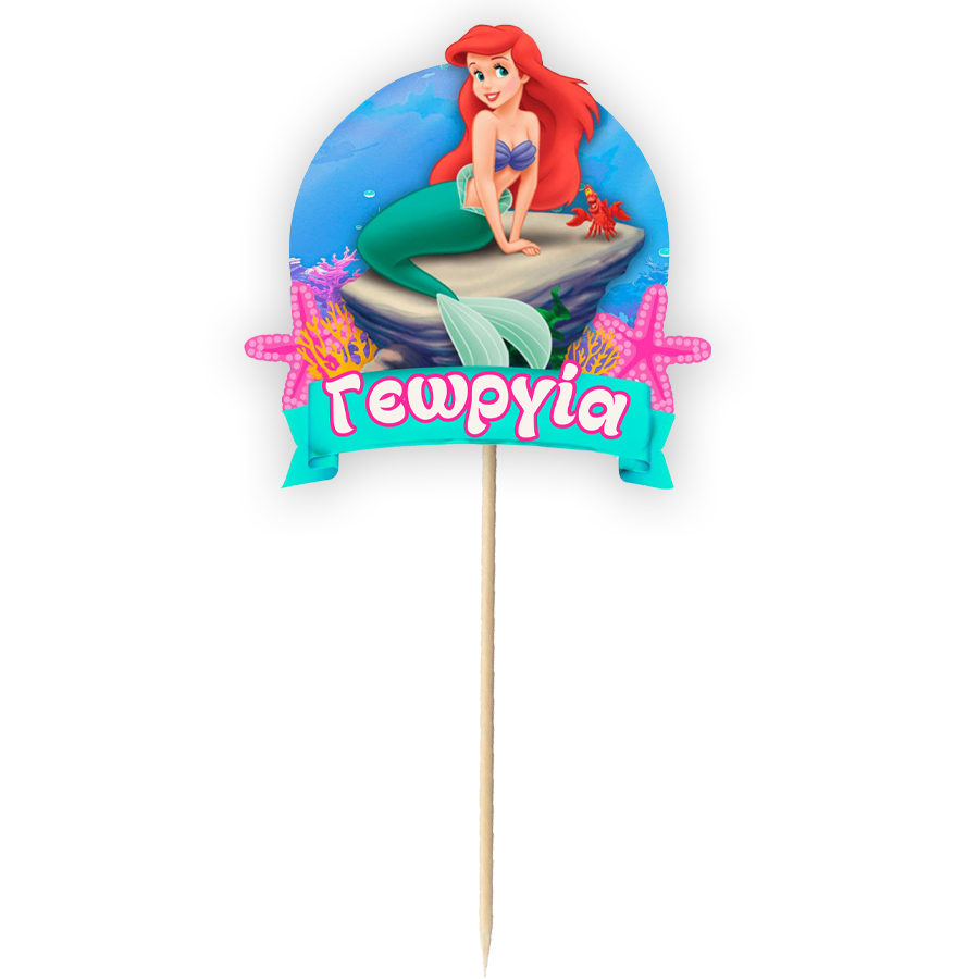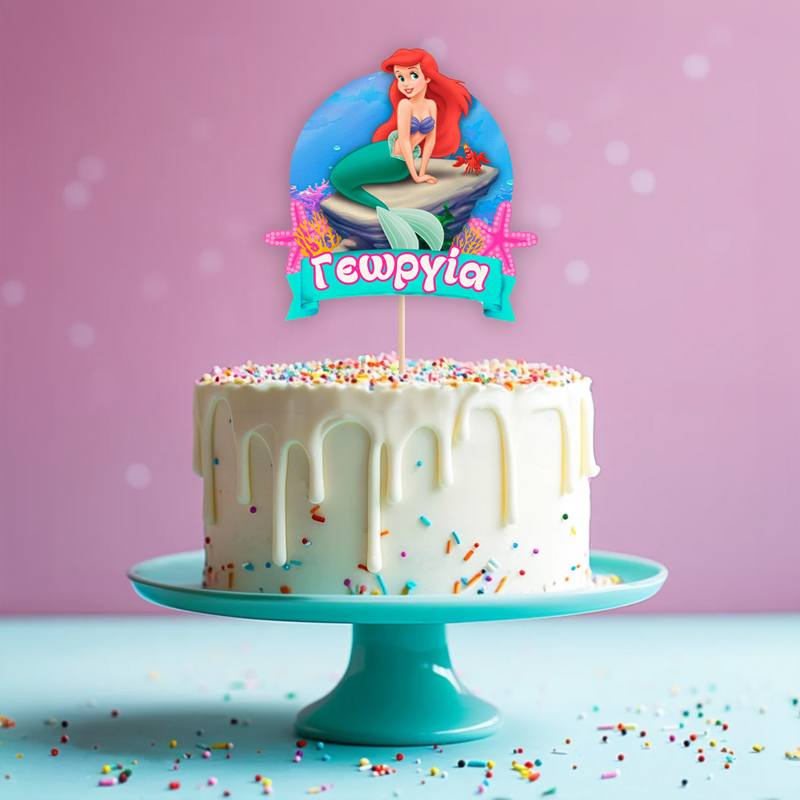 Διακοσμητικό Topper Τούρτας Γοργόνα Άριελ για να στολίσετε την τούρτα, με το όνομα της επιλογής σας τυπωμένο επάνω και να εντυπωσιάσετε!