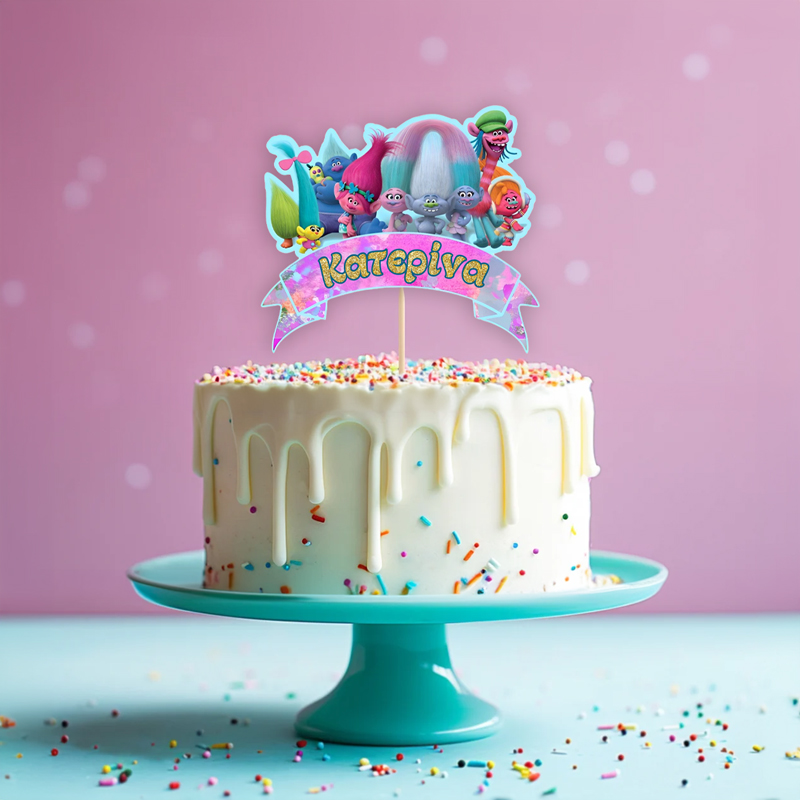 Διακοσμητικό Topper Τούρτας Trolls για να στολίσετε την τούρτα, με το όνομα της επιλογής σας τυπωμένο επάνω και να εντυπωσιάσετε!