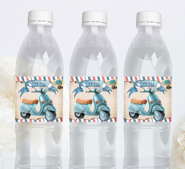 Οι μικροί καλεσμένοι δεν γίνεται να έχουν ένα κοινό μπουκάλι νερού! Μεταμορφώστε τα με τις προσωποποιημένες ετικέτες στο θέμα Βέσπα, που μπορούν να αναγράφουν το όνομα του παιδιού του.