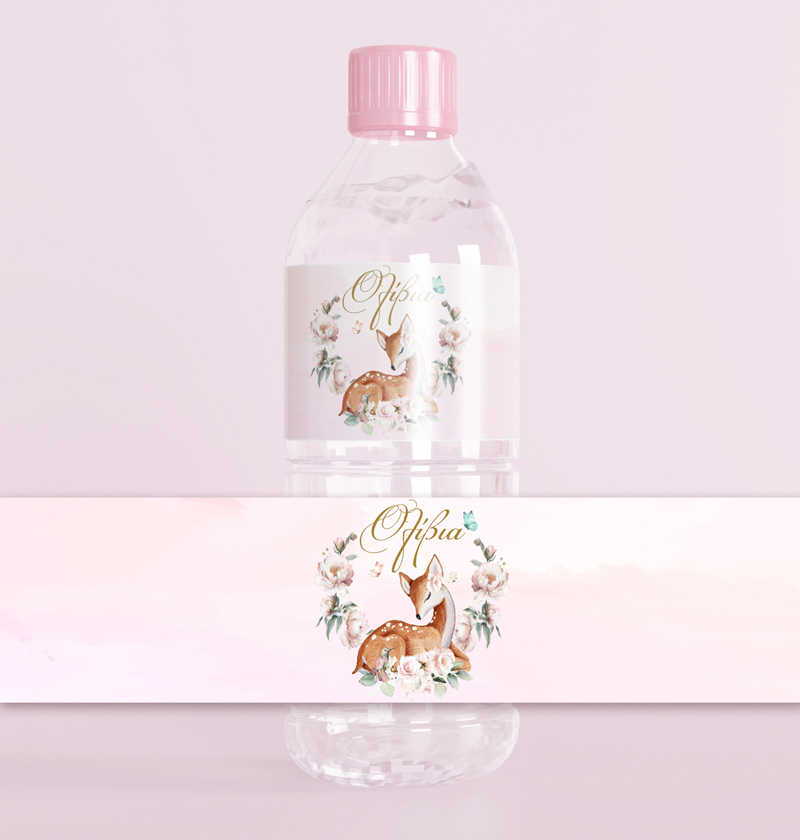 Διακοσμήστε τα μπουκαλάκια νερού με ετικέτες σε θέμα το Ελαφάκι σε φλοράλ που μπορούν να αναγράφουν το όνομα του παιδιού.