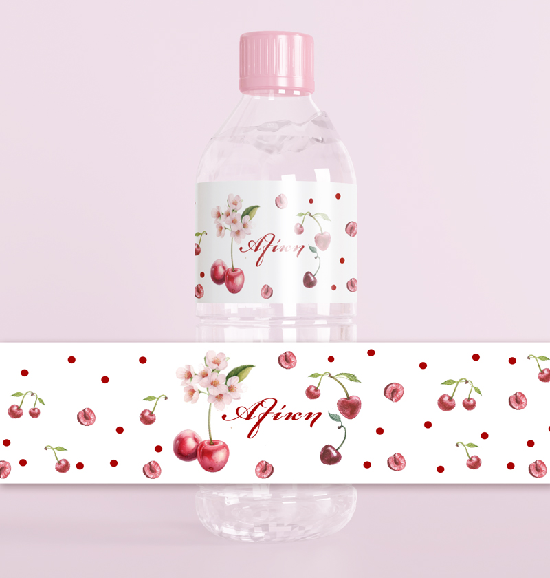 Διακοσμήστε τα μπουκαλάκια νερού με ετικέτες σε θέμα Κεράσι, που μπορούν να αναγράφουν το όνομα του παιδιού.