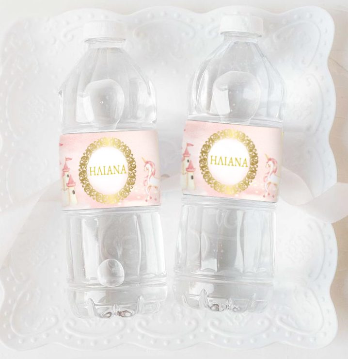 Ετικέτες για μπουκαλάκια νερού με θέμα Πριγκίπισσα & Μονόκερος και εκτυπωμένο το όνομα του μωρού σας.