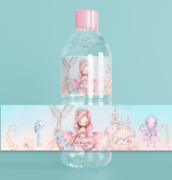 Ετικέτες για μπουκαλάκια νερού με θέμα Ροζ Γοργόνα και εκτυπωμένο το όνομα του μωρού σας.