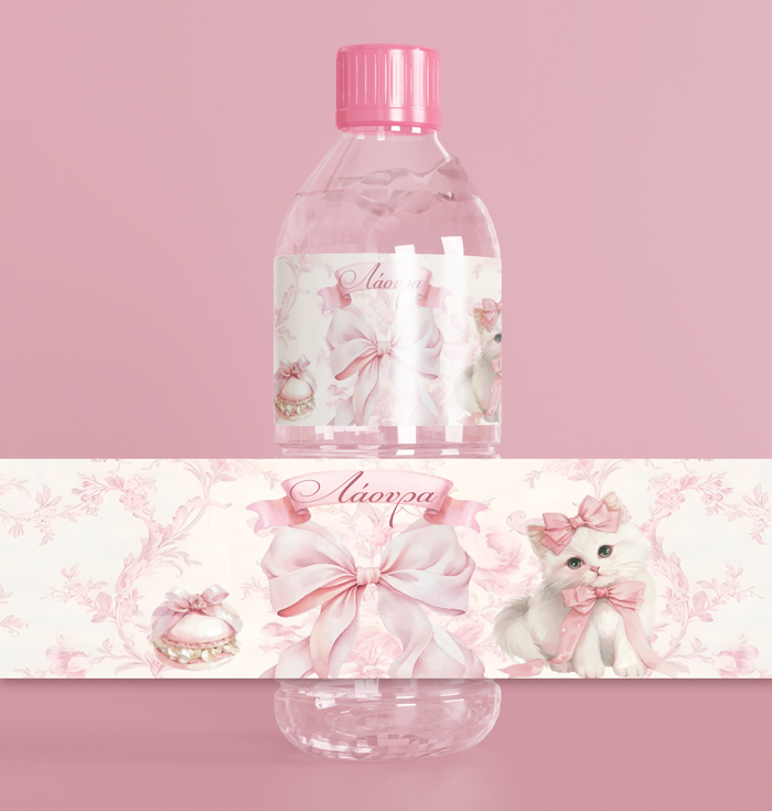 Ετικέτες για μπουκαλάκια νερού με θέμα Ροζ Φιόγκος και εκτυπωμένο το όνομα και την ημερομηνία του μωρού σας για να δώσετε μία Coquette αισθητική.