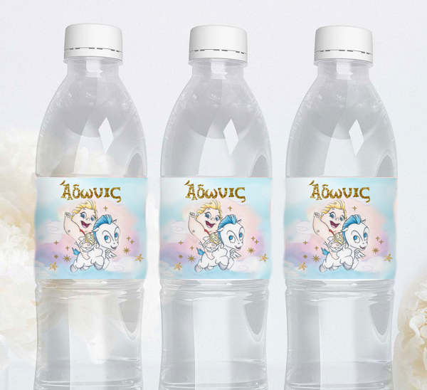 Διακοσμήστε τα μπουκαλάκια νερού με ετικέτες σε θέμα baby Ηρακλή που μπορούν να αναγράφουν το όνομα του παιδιού του.