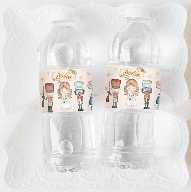 Οι μικροί καλεσμένοι δεν γίνεται να έχουν ένα κοινό μπουκάλι νερού! Μεταμορφώστε τα μπουκάλια με τις προσωποποιημένες ετικέτες νερού στο θέμα του Καρυοθραύστη, πάνω στις οποίες μπορεί να τυπωθεί το όνομα της επιλογής σας.
