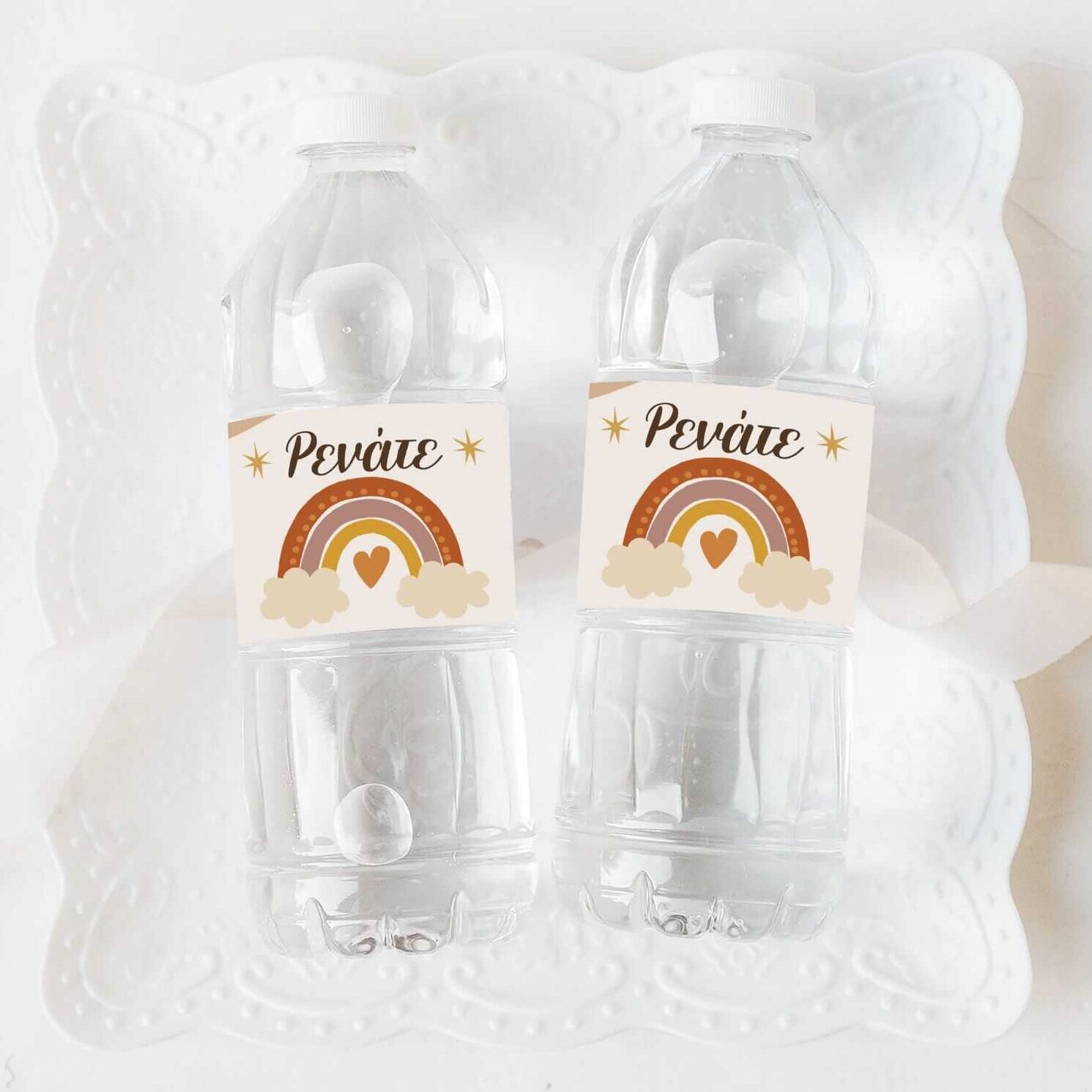 Διακοσμήστε τα μπουκαλάκια νερού με ετικέτες σε θέμα Ουράνιο Τόξο Boho που μπορούν να αναγράφουν το όνομα του παιδιού του.