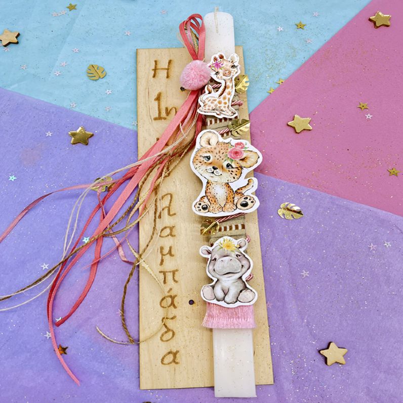 - Η λαμπάδα είναι διακοσμημένη με κορδέλες σε ταιριαστές αποχρώσεις καθώς και με ξύλινες φιγούρες με ζωάκια
