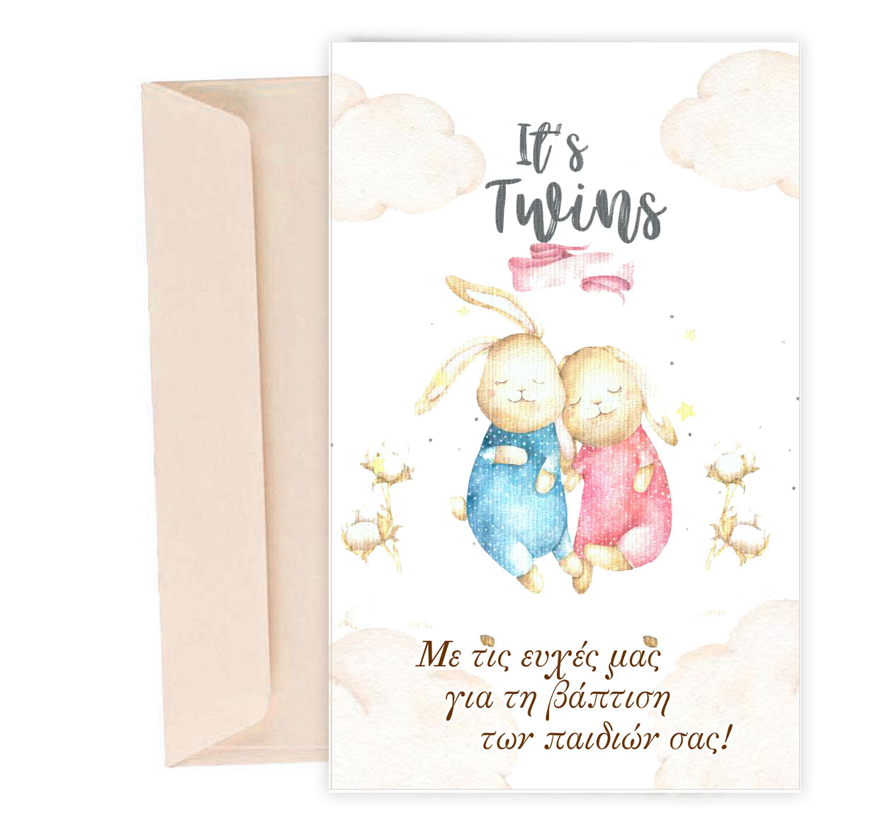 Ευχετήρια κάρτα για τη βάπτιση διδύμων – αγοράκι και κοριτσάκι! Γράψτε τις πιο θερμές ευχές σας σε μία όμορφη κάρτα με σχέδιο χαριτωμένα κουνελάκια.