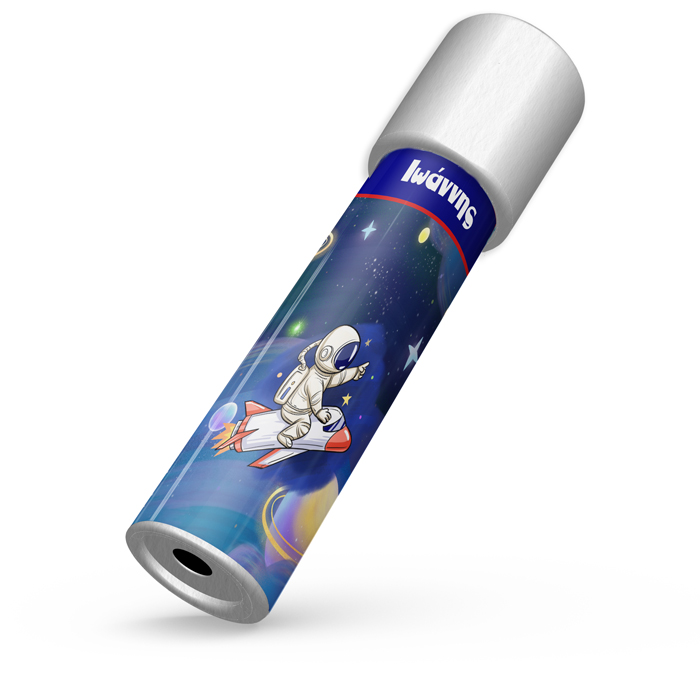 Καλειδοσκόπιο με θέμα Διάστημα, που το περιστρέφεις και αποκαλύπτονται αμέτρητα σχέδια! Ιδανικό για δώρο στους μικρούς καλεσμένους του πάρτυ, που θα τους μαγνητίσει και θα τους οδηγήσει σε ένα ατελείωτο παιχνίδι με τις αντανακλάσεις του φωτός.
