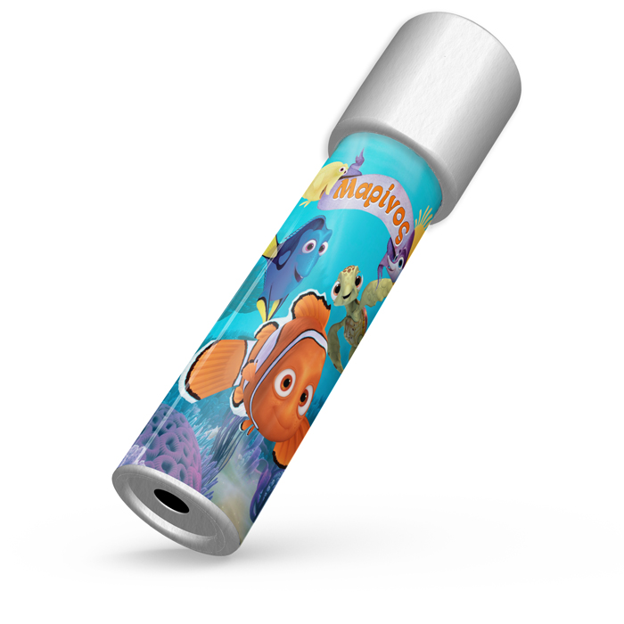 Καλειδοσκόπιο με θέμα Nemo, που το περιστρέφεις και αποκαλύπτονται αμέτρητα σχέδια! Ιδανικό για δώρο στους μικρούς καλεσμένους του πάρτυ, που θα τους μαγνητίσει και θα τους οδηγήσει σε ένα ατελείωτο παιχνίδι με τις αντανακλάσεις του φωτός.