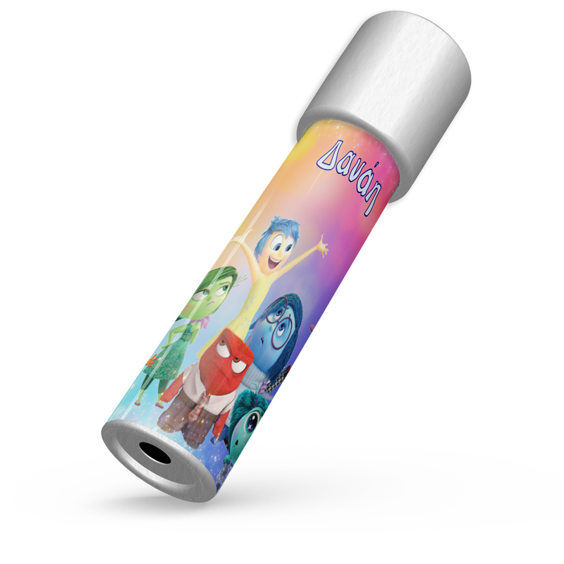 Καλειδοσκόπιο με θέμα Inside Out, που το περιστρέφεις και αποκαλύπτονται αμέτρητα σχέδια! Ιδανικό για δώρο στους μικρούς καλεσμένους του πάρτυ, που θα τους μαγνητίσει και θα τους οδηγήσει σε ένα ατελείωτο παιχνίδι με τις αντανακλάσεις του φωτός.