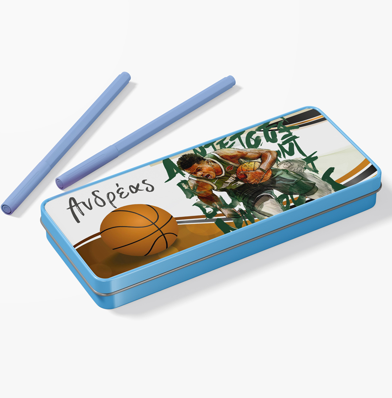 Μεταλλική γαλάζια κασετίνα με σχέδιο τον αγαπημένο Αντετοκούνμπο και τυπωμένο το όνομα! Βάλε σ’αυτή τα αγαπημένα σου σχολικά αντικείμενα ή δώρισέ την σε μια φίλη σου και ξεχωρίστε στην τάξη!