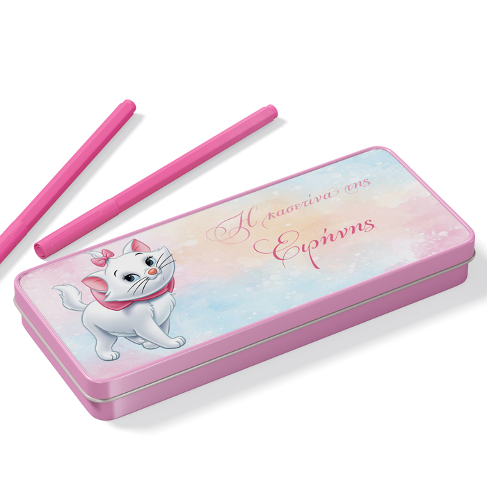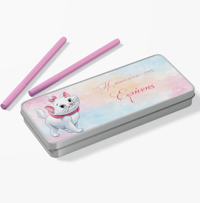 Μεταλλική κασετίνα με σχέδιο τη Γατούλα Marie από τις Αριστόγατες και τυπωμένο το όνομα! Βάλε σ’αυτή τα αγαπημένα σου σχολικά αντικείμενα ή δώρισέ την σε μια φίλη σου και ξεχωρίστε στην τάξη!