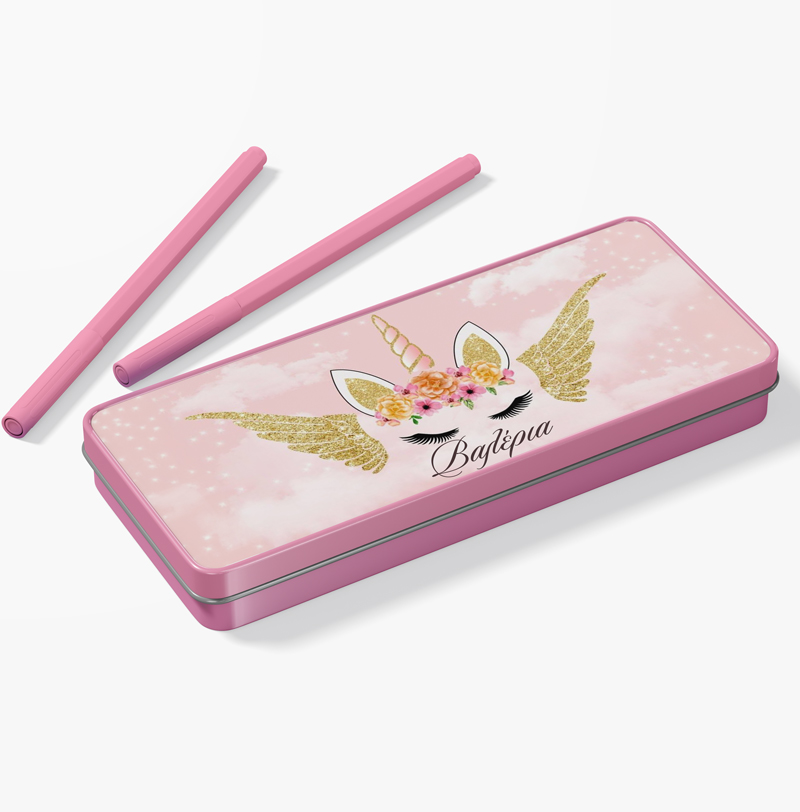Μεταλλική ροζ κασετίνα με σχέδιο Μονόκερο και τυπωμένο το όνομα! Βάλε σ’αυτή τα αγαπημένα σου σχολικά αντικείμενα ή δώρισέ την σε μια φίλη σου και ξεχωρίστε στην τάξη!