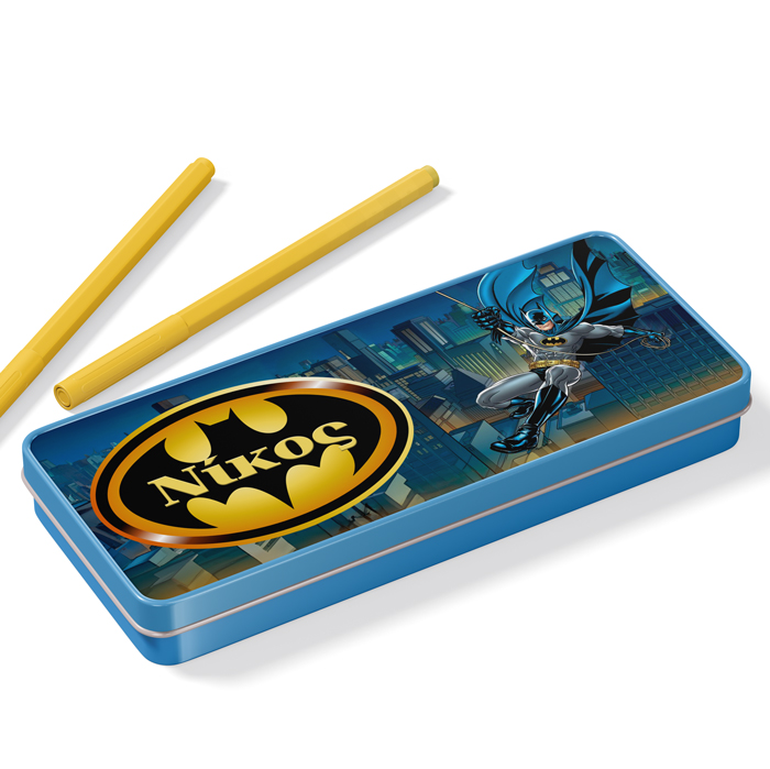 Μεταλλική γαλάζια κασετίνα με σχέδιο Batman και τυπωμένο το όνομα! Βάλε σ’αυτή τα αγαπημένα σου σχολικά αντικείμενα ή δώρισέ την σε μια φίλη σου και ξεχωρίστε στην τάξη!