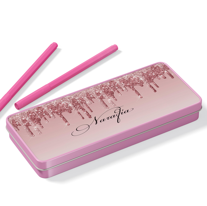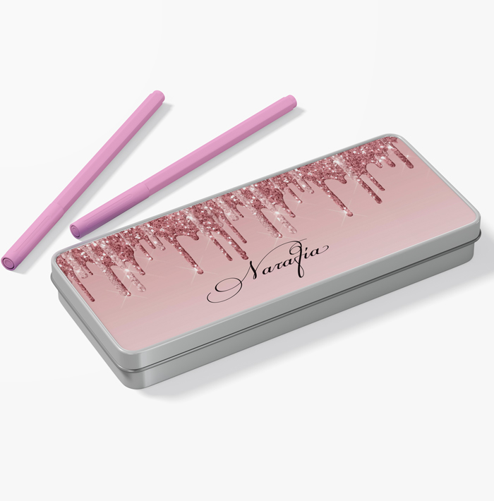 Μεταλλική κασετίνα με σχέδιο ροζ-χρυσό γκλίτερ και τυπωμένο το όνομα! Βάλε σ’αυτή τα αγαπημένα σου σχολικά αντικείμενα ή δώρισέ την σε μια φίλη σου και ξεχωρίστε στην τάξη!