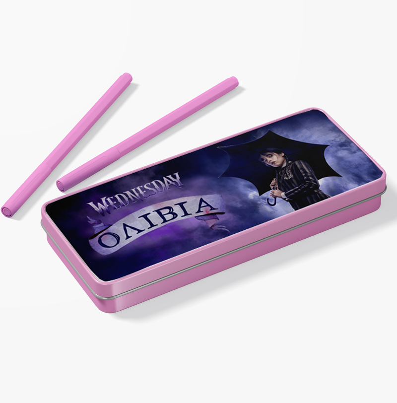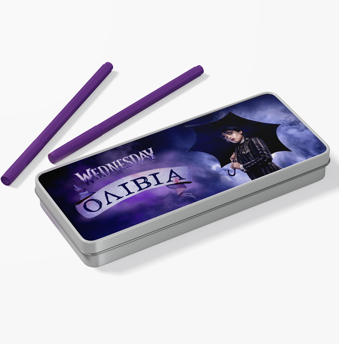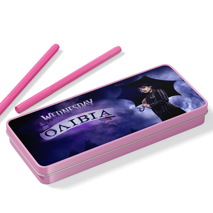 Μεταλλική κασετίνα με σχέδιο Wednesday και τυπωμένο το όνομα! Βάλε σ’αυτή τα αγαπημένα σου σχολικά αντικείμενα ή δώρισέ την σε μια φίλη σου και ξεχωρίστε στην τάξη!