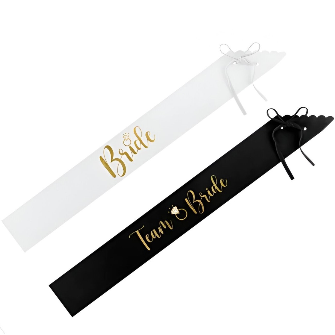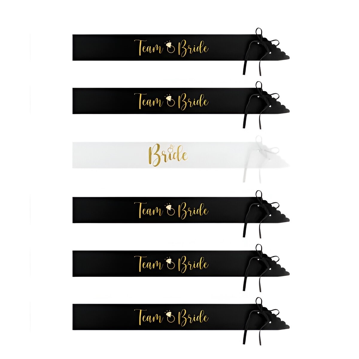 - Περιλαμβάνονται 6 σατέν κορδέλες με χρυσά μεταλλικά γράμματα (1x άσπρη Bride, 5 x μαύρες Team Bride)