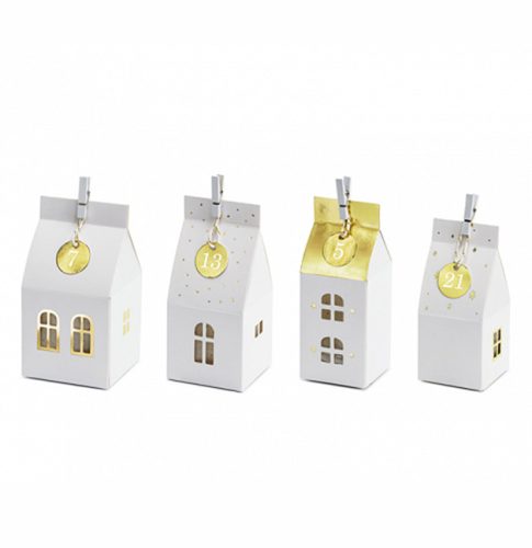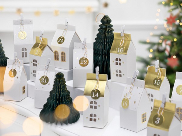 - Χάρτινα κουτάκια-σπιτάκια με χρυσές μεταλλικές λεπτομέριες σε 3 σχέδια από 8 τεμάχια στο καθένα, διαστάσεις: 5 x 11 x 5 cm έως 7 x 11 x 5 cm