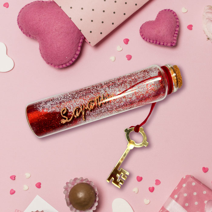 - γυάλινο μπουκαλάκι με κόκκινο γκλίτερ, ξύλινο κρεμαστό Σ ‘αγαπώ και χρυσό plexi κλειδάκι