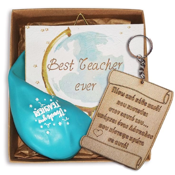 - Περιλαμβάνει: 1 ξύλινο καδράκι “Best Teacher Ever”, 1 ξύλινο μπρελόκ, 1 μπαλόνι “Thank You Teacher”