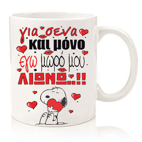 Κούπα για να χαρίσετε στο άλλο σας μισό, με αξιολάτρευτο σκυλάκι Snoopy και μήνυμα “Για σένα και μόνο εγώ μωρό μου ΛΙΩΝΩ”