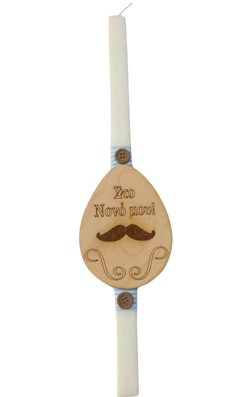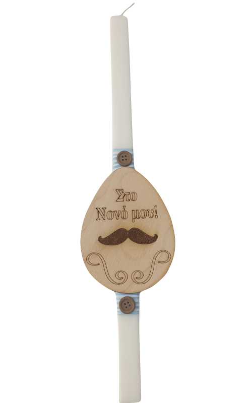- Το διακοσμητικό της λαμπάδας είναι ξύλινο 15 εκ. σε σχήμα αυγού και χάραξη “Στο νονό μου!”
