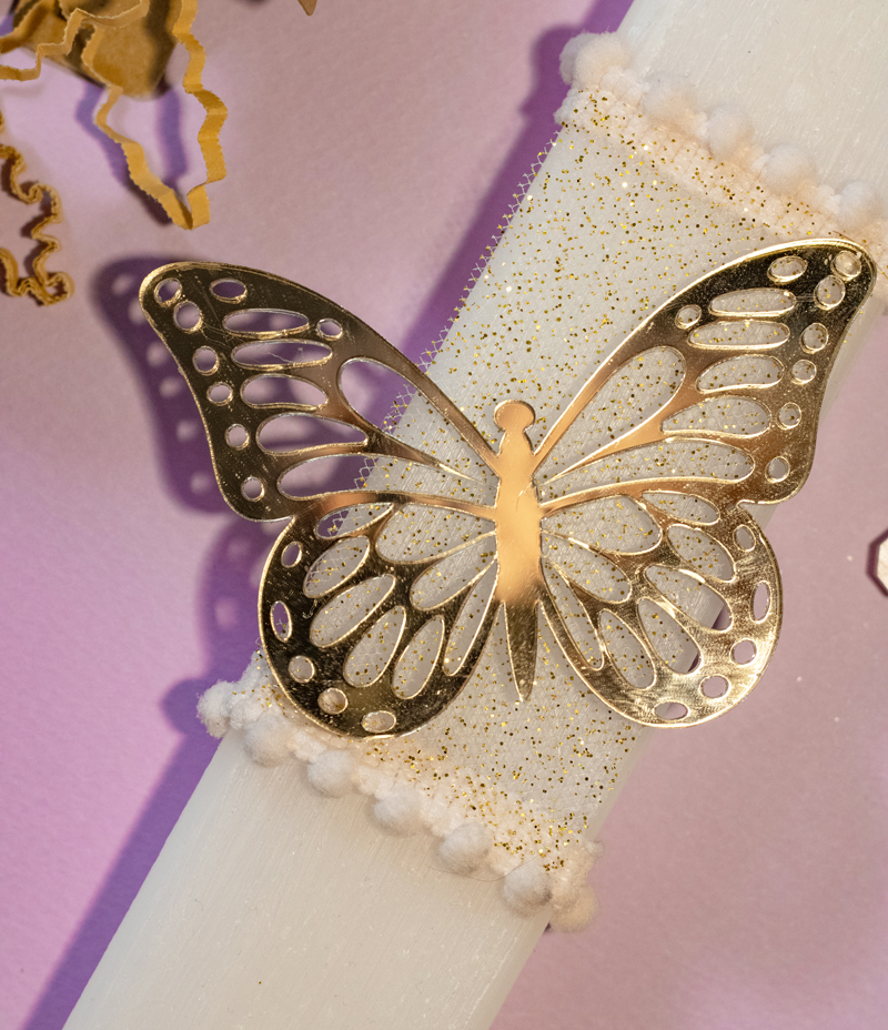 Πασχαλινή Αρωματική Λαμπάδα Χρυσή Plexi πεταλούδα, με υλικά και κορδέλες, που θα κλέψει τις εντυπώσεις!