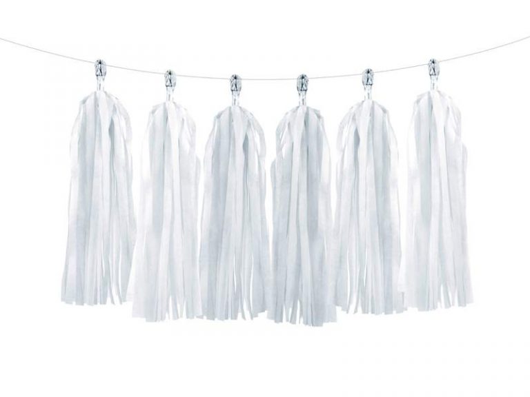 Tassel garland με χάρτινες φούντες σε χρώμα λευκό.