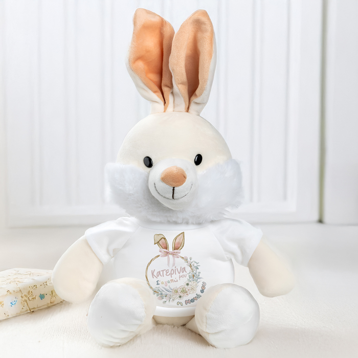 Λούτρινο λαγουδάκι με λευκό T-Shirt τυπωμένο με το μήνυμα της επιλογής σου, για να χαρίσεις στη βαπτιστήρα σου για το Πάσχα και να της δείξεις πόσο σημαντική είναι για σένα!